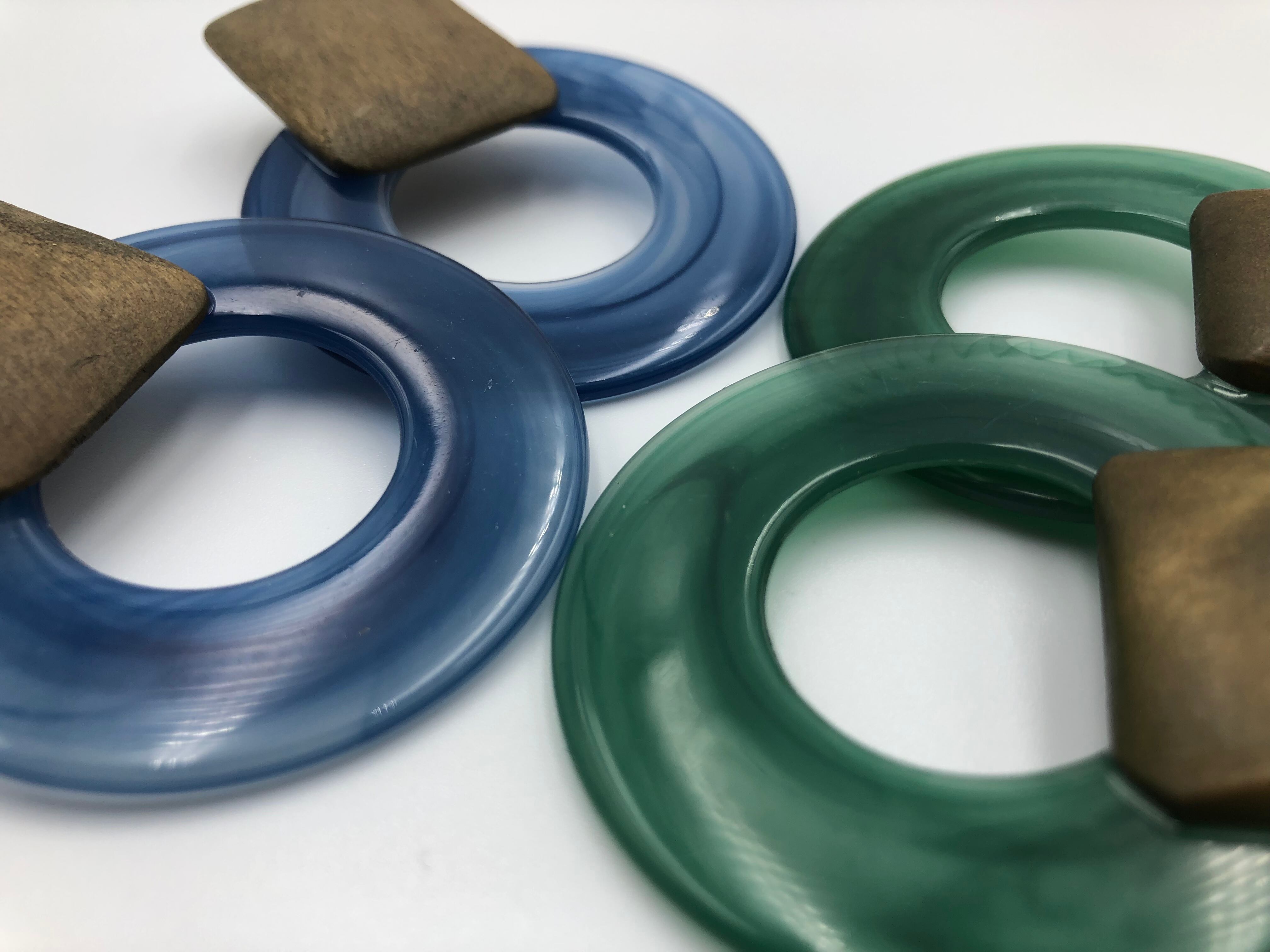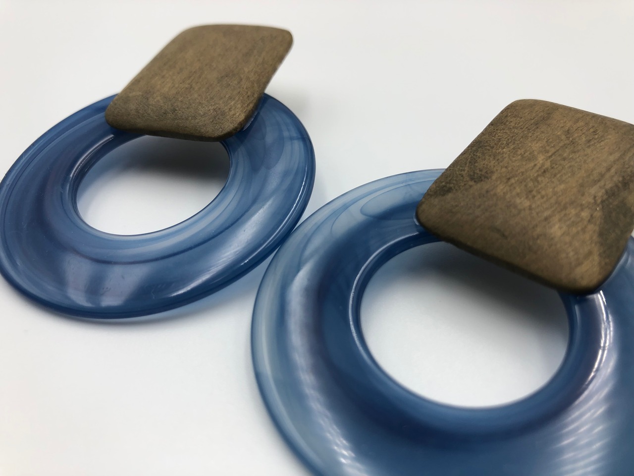 ウッドのスクエアモチーフとクリアなサークルモチーフの付いたピアスです。