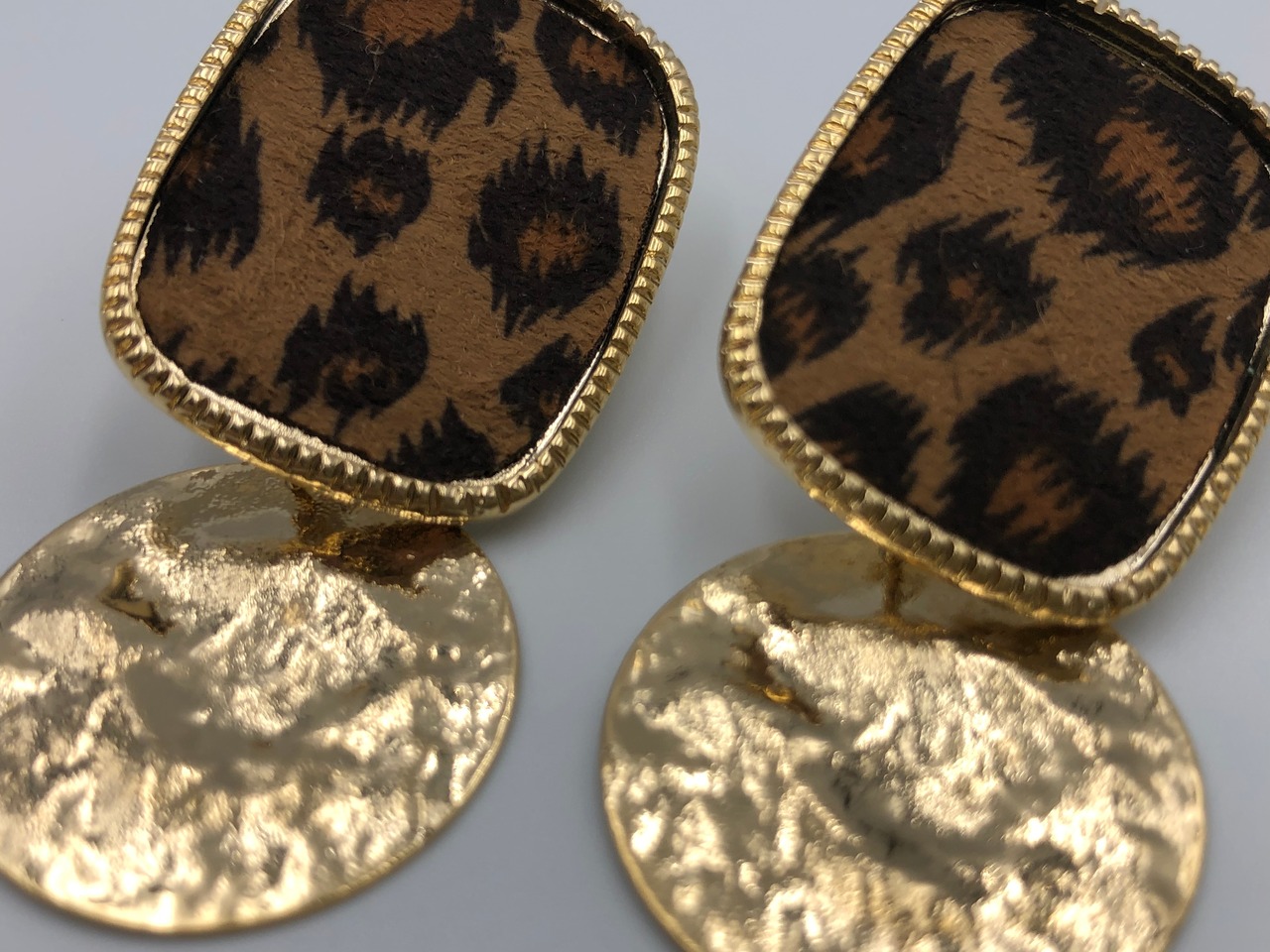 ゴールドベースのスクエア型にヒョウ柄が細工されています。ヒョウ柄はフェルト素材です。