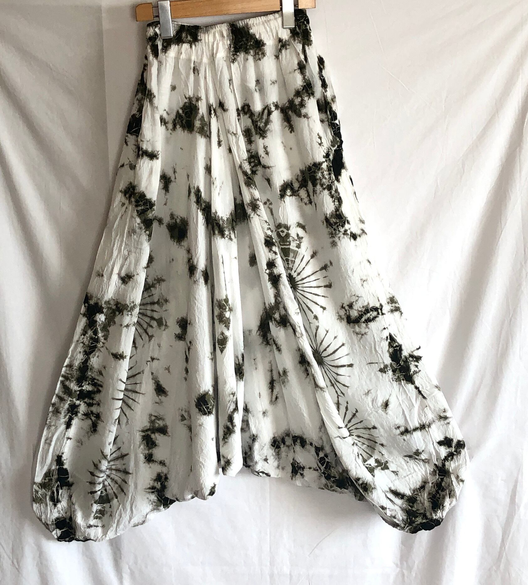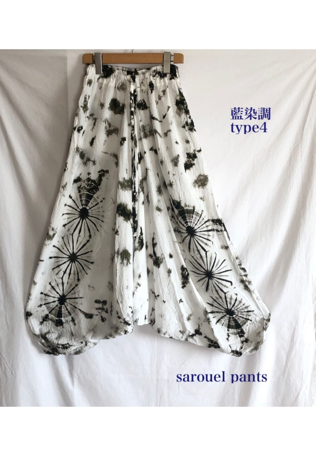 人気の藍染調デザインのサルエルパンツ。